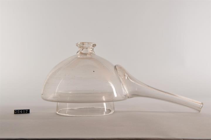 Destillierhelm aus farblosem Glas und Einfüllstutzen, hergestellt durch Aufschmelzens eines Glaspostens und ausziehen desselben. Aufgelegter Faden am Mündungsrand. Einfüllstutzen innen teilweise geschliffen. Ablaufrohr teilweise abgeschlagen. gebrauchsspuren innen. Im Alembic kondensierten die aufsteigenden Dämpfe, wurden abgekühlt und liefen über das Ablaufrohr in ein Auffanggefäß (Fürsetzglas).