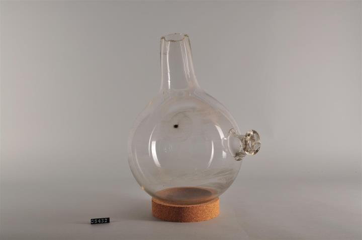 Bauchiges Gefäß aus farblosem Glas mit oben längerer, flaschenhalsförmiger Öffnung und seitlich mittig angesetztem Füllstutzen. Diente zum Verdampfen der Flüssigkeit. Der Destillierhelm (Alembic) wurde auf den Hals des Destillierkolbens (Cucurbit) gesetzt. Die aus dem Destillierkolben aufsteigenden Dämpfe kondensierten im Destillierhelm und wurden in einer Vorlage aufgefangen.