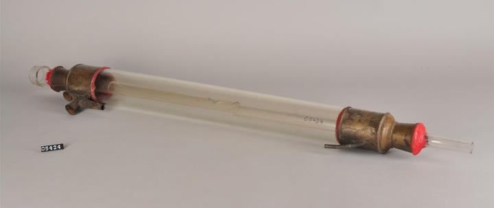 Der Liebigkühler besteht aus einem geraden Glasrohr mit Wassermantel. Zwischen dem inneren und äußeren Rohr fließt Kühlwasser das die Dämpfe im inneren Rohr zum Kondensieren bringt. Das Kühlwasser wird über eine Blechverbindung eingeführt und abgeleitet. Die Blechverbindung ist mit Siegellack abgedichtet. Einfüllstutzen ist mit dickem Glasfaden umgeben. Inneres Rohr gebrochen.