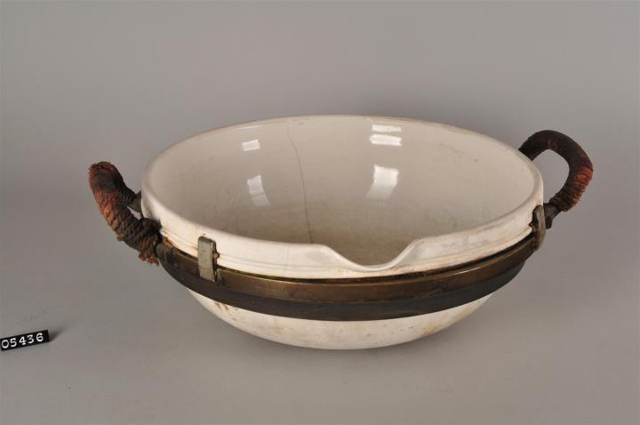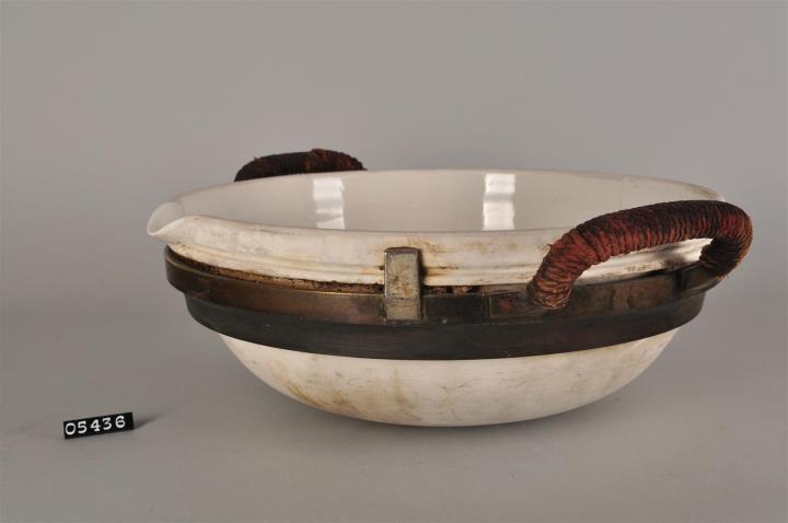 Stark gebauchte Reib- oder Abdampfschale aus Porzellan. Runder Boden. Schüssel mit Sprung, deshalb massiver Metallring aus Bronze mit zwei spagatumwickelten horizontal aufgesetzten, aufgebogenen Henkeln. Angesetzter Ausguß.