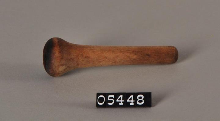 Hölzernes Werkzeug aus Ahornholz, geschliffen, unbenutzt. Zylindrischer Griff, sich vorne pilzförmig vergrößernd. Der Pistill wird zum Verreiben und Mischen von cremigen oder pulvrigen Substanzen verwendet.
