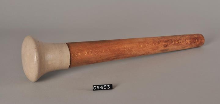 Hölzernes Werkzeug aus Hartholz mit eingelassenem sich glockenförmig erweiternden Keramikknopf. Zylindrischer Holzgriff. Der Pistill wird zum Verreiben und Mischen von cremigen oder pulvrigen Substanzen verwendet.