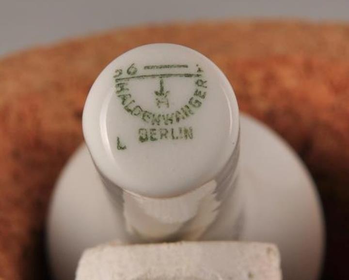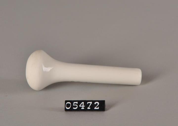 Pistill aus Porzellan: Stabähnlicher, unten verdickter und abgerundeter Gegenstand zum Zerstoßen und Zerreiben von Substanzen. Leicht aufgerauhter pilzförmiger Kopf mit Gebrauchsspuren. Firmenzeichen der Firma Haldenwanger am Griffende.