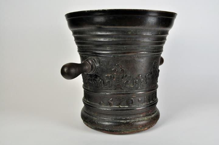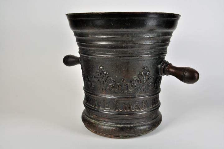 Schwerer Mörser, ausgebogener Mündungsrand, mit Inschrift "1670 HERMANNUS BULLINGEN" als Band am unteren Rand. In der Mitte rundum dekorative Verzierungen. Zwei massive Griffe. Der Mörsers weist strake Gebrauchspuren auf. Stößel mit Öse zum Einhägen an einer Stange (Schwungstange) mit Seil und Hacken, diente zur Arbeitserleichterung. War bis zum Jahre 1980 in der Stoßkammer der Stadtapotheke in Verwendung.
