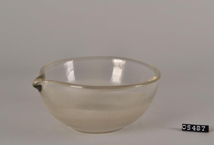 Dickwandige Schalenform aus farblosem Glas mit Ausguss. Innenseite halbkugelig gerundet und bis zur halben Höhe aufgeraut. Glatter Rand. Am Standboden geschliffene runde Vertiefung durch das Wegschleifen des Hefteisenabrisses. Zum Verreiben und Mischen fester und halbflüssiger Substanzen.