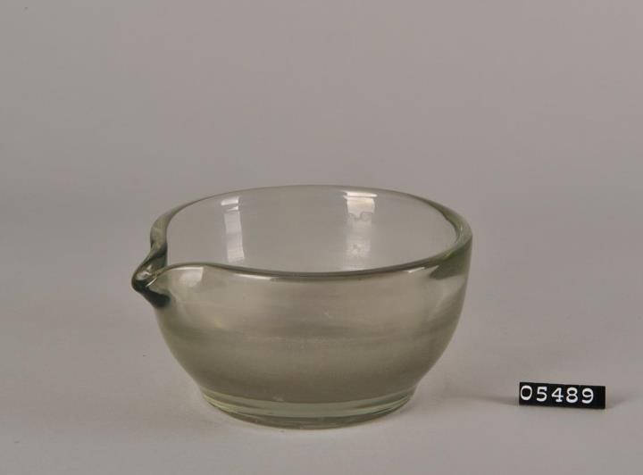 Dickwandige Schalenform aus farblosem Glas mit Ausguss. Innenseite halbkugelig gerundet und bis zur halben Höhe aufgeraut. Glatter Rand. Am Standboden geschliffene runde Vertiefung durch das Wegschleifen des Hefteisenabrisses. Zum Verreiben und Mischen fester und halbflüssiger Substanzen.