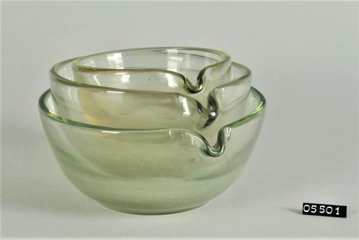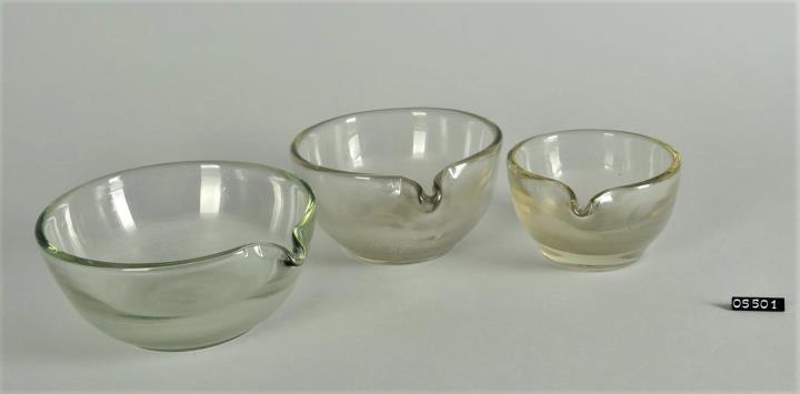 Dickwandige Schalenform aus farblosem Glas mit Ausguss und Standfuß. Innenseite halbkugelig gerundet und bis zur halben Höhe aufgeraut. Glatter Rand. Am Standboden geschliffene runde Vertiefung durch das Wegschleifen des Hefteisenabrisses. Satz mit drei Schalen. Zum Verreiben und Mischen fester und halbflüssiger Substanzen.