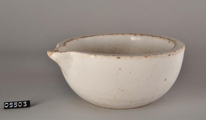Dickwandige Schalenform aus Porzellan mit Ausguss. Standboden leicht nach innen gewölbt. Mit Prägung. Innenseite halbkugelig gerundet. Glatter Rand mit starken Gebrauchsspuren. Reibschalen wurden zum Verreiben und Mischen fester und halbflüssiger Substanzen verwendet.