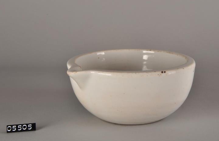 Dickwandige Schalenform aus Porzellan mit Ausguss. Standboden leicht nach innen gewölbt. Mit undeutlicher Prägung. Innenseite halbkugelig gerundet und bis zur halben Höhe aufgerauht. Glatter Rand. Reibschalen wurden zum Verreiben und Mischen fester und halbflüssiger Substanzen verwendet.