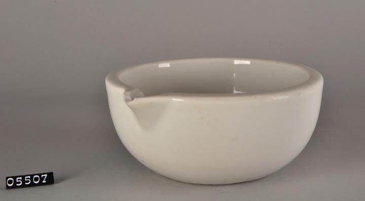 Dickwandige Schalenform aus Porzellan mit Ausguss. Standboden leicht nach innen gewölbt. Mit unleserlicher Bodenprägung. Innenseite halbkugelig gerundet, bis zur halben Höhe aufgerauht. Glatter Rand. Reibschalen wurden zum Verreiben und Mischen fester und halbflüssiger Substanzen verwendet.