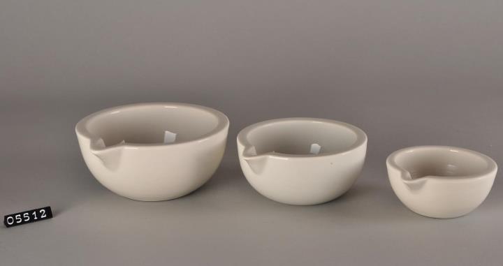 Set mit drei Reibschalen mit Preisangaben mit Lire 10.60, Lire 4.- und Lire 3,85. Dickwandige Schalenform aus Porzellan mit Ausguss. Standboden leicht nach innen gewölbt. Mit Bodenprägung. Innenseite halbkugelig gerundet, eine davon bis halber Höhe aufgerauht. Ohne Gebrauchsspuren da Verkaufsware. Glatter Rand. Reibschalen wurden zum Verreiben und Mischen fester und halbflüssiger Substanzen verwendet.