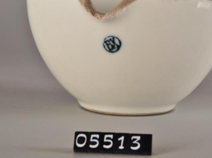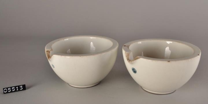 Zwei Reibschalen mit Unterglasur-Stempel. Dickwandige Schalenform aus Porzellan mit teilweise abgeschlagenem Ausguss und angeschlagenem Rand. Standboden leicht nach innen gewölbt. Bodenprägung mit der Zahl 125. Innenseite halbkugelig gerundet. Gebrauchsspuren. Glatter Rand. Reibschalen wurden zum Verreiben und Mischen fester und halbflüssiger Substanzen verwendet.