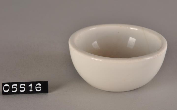 Dünnwandige Schalenform aus Porzellan. Leicht nach innen gewölbter Standboden mit Prägung "624". Innenseite halbkugelig gerundet und glatt. Glatter Rand, ohne Ausguss. Reibschalen wurden zum Verreiben und Mischen fester und halbflüssiger Substanzen verwendet.