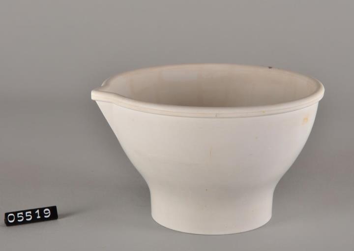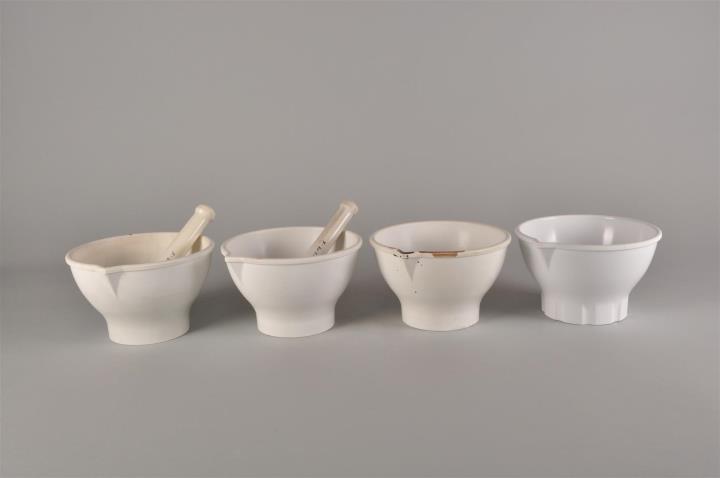 Kunststoff-Reibschale aus Melamin, weiß mit Standfuß und Ausguss. Sterilisierbar bis 121Grad Celsius. Fassungsvermögen 700ml. Zwei mit Pistill. Am Boden geprägt mit "Melamin" und dem Firmenzeichen (PS). Eine davon mit geriffeltem Standfuß. Reibschalen werden zum Verreiben und Mischen fester und halbflüssiger Substanzen verwendet.