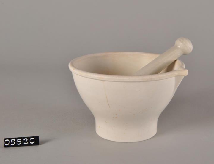 Kunststoff-Reibschale aus Melamin, weiß mit Standfuß, Ausguss und Pistill mit ergonomisch geformten Griff. Sterilisierbar bis 121Grad Celsius. Am Boden geprägt mit "Melamin" und dem Firmenzeichen (PS) sowie die Nummer "4495". Reibschalen werden zum Verreiben und Mischen fester und halbflüssiger Substanzen verwendet.