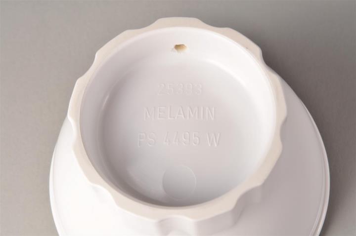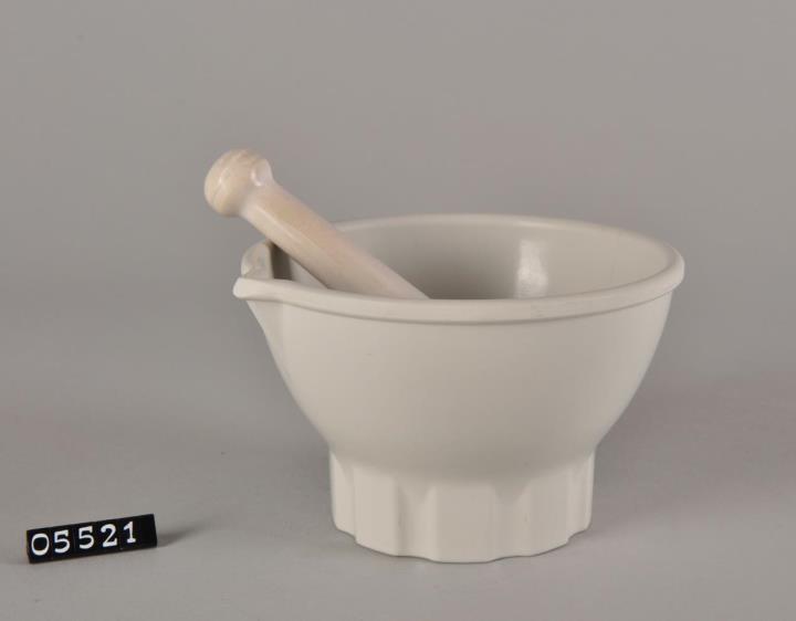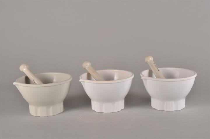 Drei Kunststoff-Reibschalen aus Melamin, weiß mit geriffeltem Standfuß, Ausguss und Pistill mit ergonomisch geformten Griff. Sterilisierbar bis 121Grad Celsius. Alle mit Bodenprägung: Nummern und "Melamin". Eine davon mit Prägung "Mikrowelle". Alle mit Pistill. Reibschalen werden zum Verreiben und Mischen fester und halbflüssiger Substanzen verwendet.