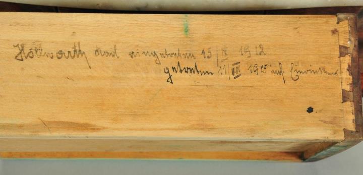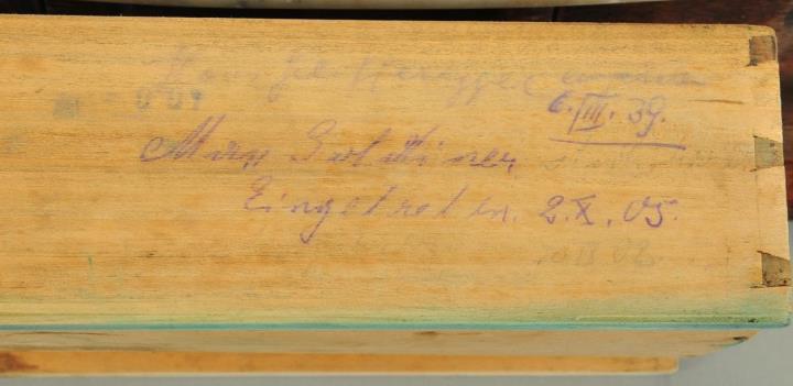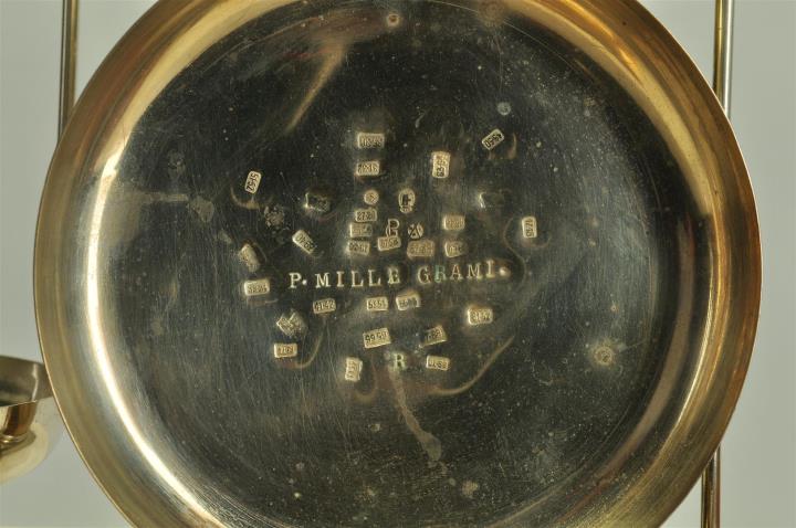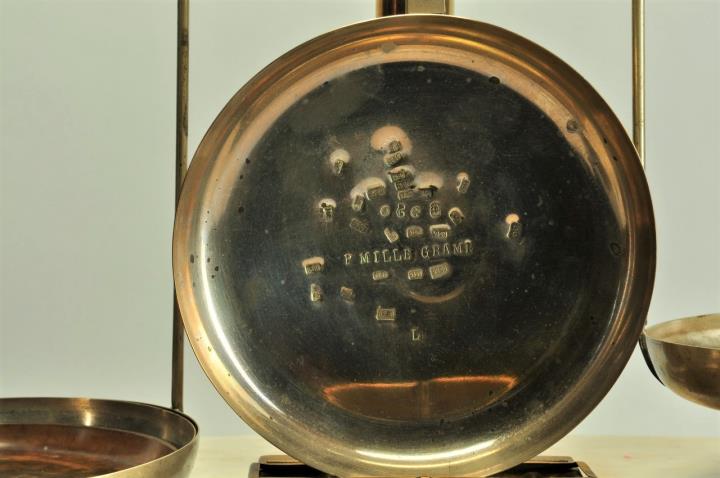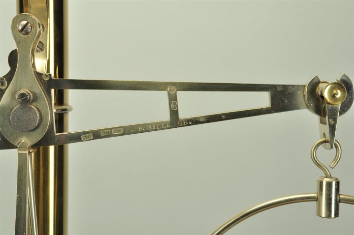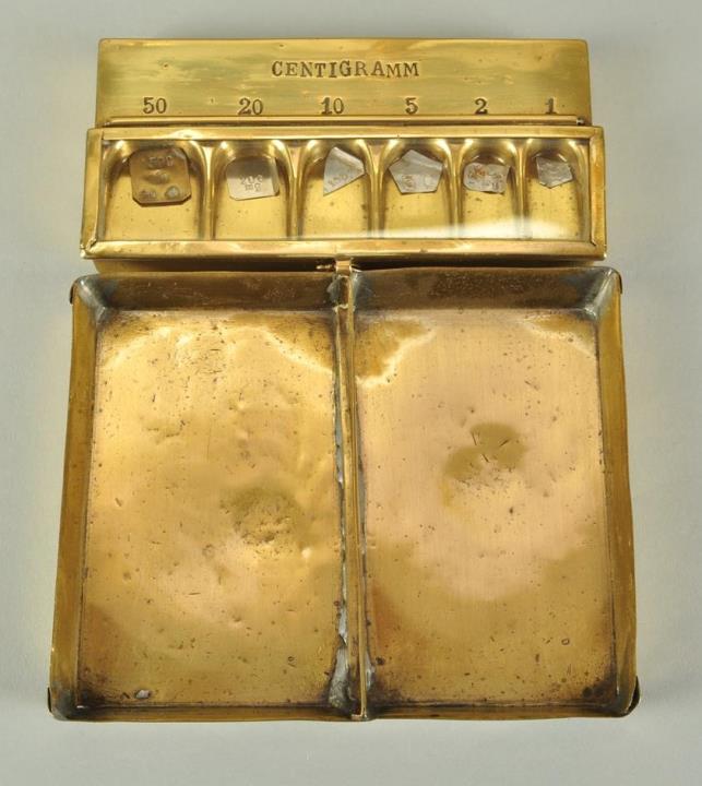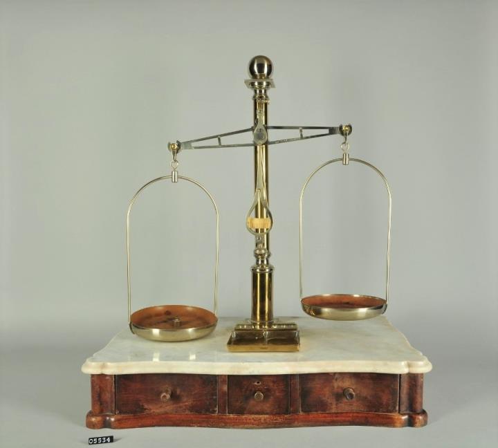 Balken- oder Apothekerwaage, auch Rezeptur- oder Tarawaage genannt. Aus Messing. Waagkasten aus Holz mit drei Schubladen und profilierter und geschwungener Marmorabdeckung. Mittlere Schublade mit Loch für Rezepturfaden. Runde Waagsäule. Waagrechter, symetrischer, zweiarmiger, durchbrochener Balken, prismatische Endachsen, abnehmbare Schalen, 155mm Durchmesser an Doppelstangen. Senkrechter Zeiger, mit Gradbogen (=Skala) aus Elfenbein. Tragkraft 1kg. Um Schneiden und Balken zu schonen liegt auf einer Waagschale immer ein Gewicht. Hier 20g. Waag-Einlegeschalen aus Preßstoff (Bakelit?). Verschließbarer Messingbehälter (Etui) für Zentigrammgewichte aus Aluminium mit Glasabdeckung. Viele Eichstempel. An der Aussenwand von Mitarbeitern beschriftete Schubladen. Stand bis ca.1996 auf dem Handverkaufstisch, nachdem der Computer eingeführt wurde, benötigte man den Platz für die Bildschirme. Waagkasten aus dem 19.Jh.