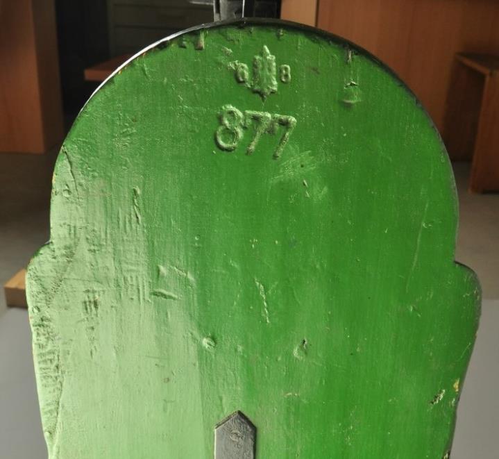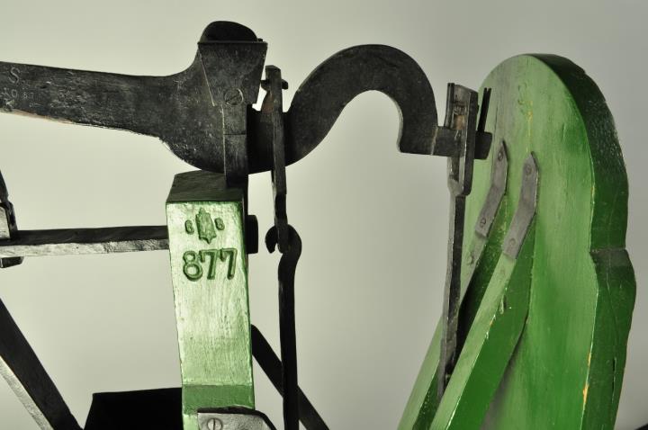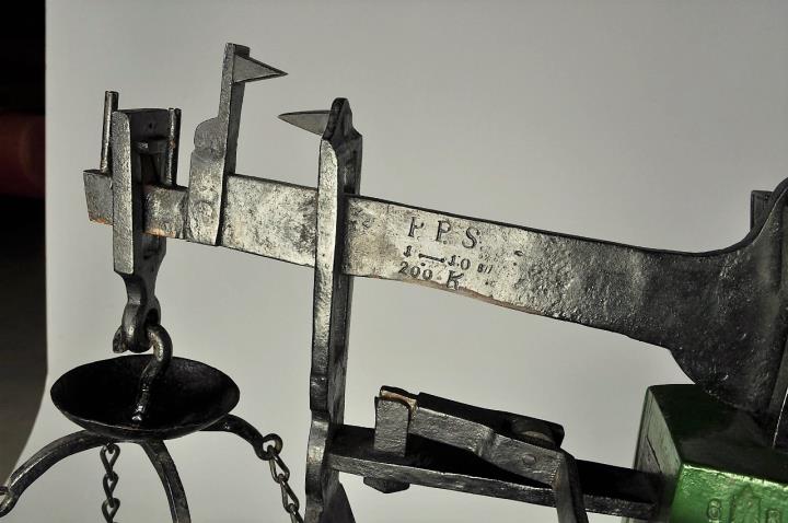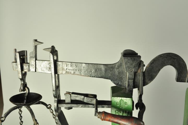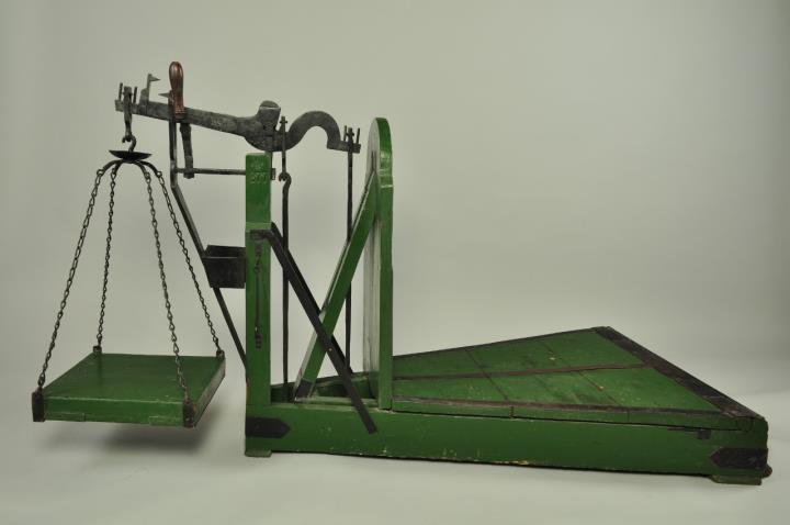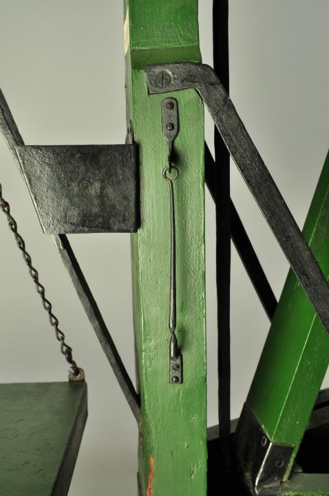 Dezimal-Brücken-Waage, erstklassiges Fabrikat, Gestell aus gutem, trockenen Holz, Schneiden und Pfannen aus Stahl, sonst alles aus Schmiedeeisen, mit dreieckiger Brücke und Bandeisen-Beschlag. Holzteile aus Kiefernholz, grün lackiert, Eisenteile zum Rostschutz schwarz angestrichen. Symmetrische, d.h. gleichschenklige Brücke inTrapezform. Waagschale (Gewichtsschale), quadratisch, hängt an vier Eisenketten. Über den Hebel mit dem Holzgriff kann sie verriegelt werden. Die Dezimalwaage ist eine ungleicharmige Waage, deren Last durch den zehnten Teil ihres Gewichtes im Gleichgewicht gehalten wird. Tragkraft bis 200kg.