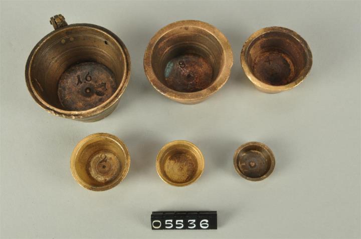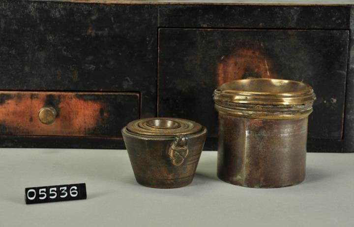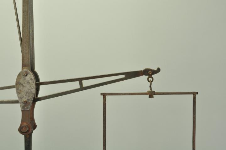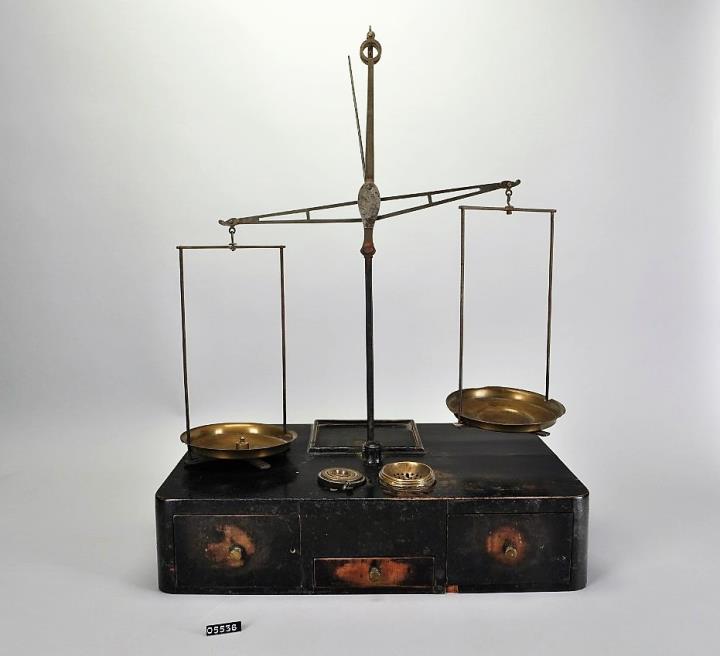Balken- oder Apothekerwaage, auch Rezeptur- oder Tarawaage genannt. Aus Eisen. Schwarzer Waagkasten aus Holz mit drei Schubladen und abgerundeten Ecken, davon linke mit Loch für Rezepturfaden. Rechteckige filigrane Waagsäule. Durchbrochener Balken mit französisches Gehänge. Abnehmbare Schalen, 145mm Durchmesser an rechteckigen Doppelstangen. Zeiger senkrecht nach oben. Keine Angabe derTragkraft. Um Schneiden und Balken zu schonen liegt auf einer Waagschale immer ein Gewicht. Hier ein Gewicht mit 15,27g. Waagschalen aus Messing. Im Waagkasten versenktes unvollständiges Einsatzgewicht und Behälter für Tarierschrot. Ohne Eichstempel.