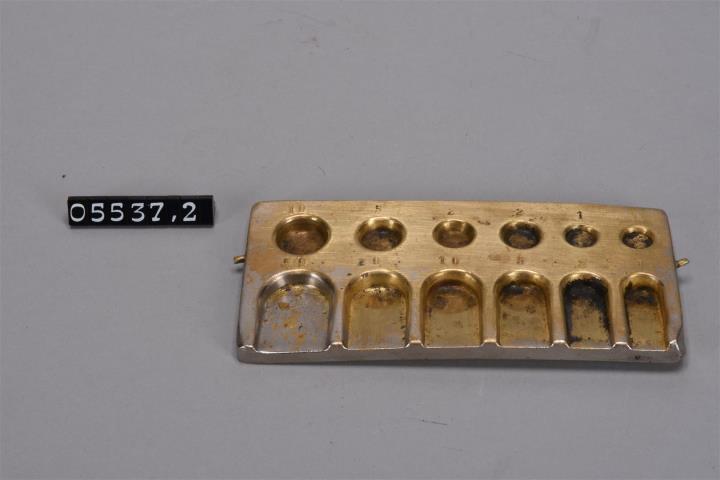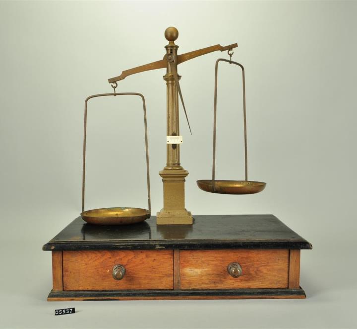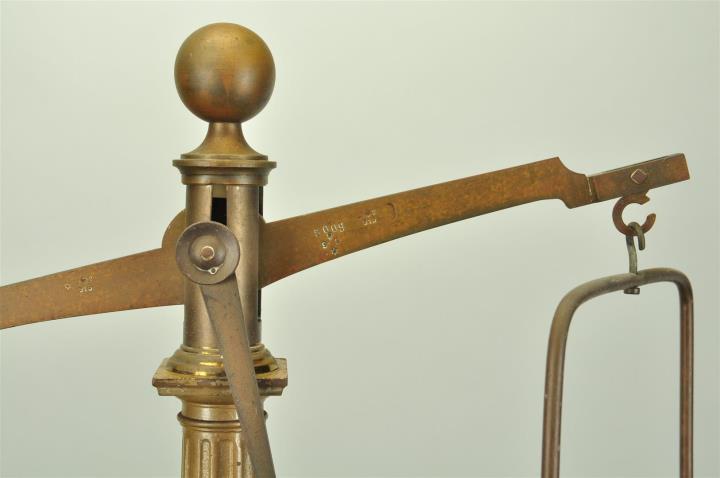 Balken- oder Apothekerwaage, auch Rezeptur- oder Tarawaage genannt. Aus Eisen, angemalen. Waagkasten aus Holz, schwarze Abdeckung mit Profil, zwei Schubladen. Waagsäule klassizistisch ausgeführt. Balken mit französischem Gehänge. Fixe Schalen aus Messing, 160mm Durchmesser an rechteckigen Doppelstangen. Zeiger nach unten, Skala (Gradbogen) aus Elfenbein. Tragkraft 500g. Dazu verbogenes Messingetui für Centigrammgewichte mit seitlichen Stiften für Deckel(?). Um Schneiden und Balken zu schonen liegt auf einer Waagschale immer ein Gewicht. Hier ein Gewicht mit 20g. Einige Eichstempel.