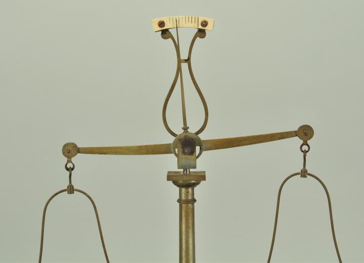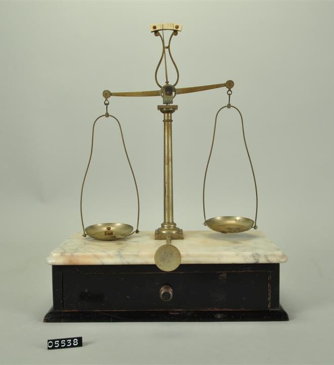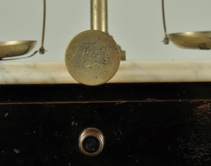 Präzisions-Dispensierwaage. System Trébuchet. Schwarzer Waagkasten aus Holz, Marmorabdeckung, eine Schublade. Waagbalken aus Stahl mit nach oben spielendem Zeiger. Gewölbte Skala für den Zeiger. Abnehmbare Schalen, 65mm Durchmesser. Zwei Eichstempel. Keine Angabe derTragkraft. Mit Drehhebelarretierung. Gravur am Knopf der Drehhebelarretierung: J.Florenz, Wien, Meisterzeichen von Florenz, Waagmacher in Wien.