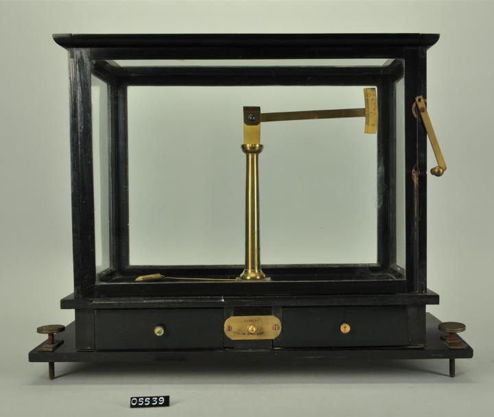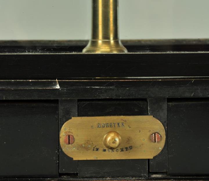 Einarmige spezifische Waage. Schwarze Grundplatte mit Stellschrauben, darauf schwarz polierter Glaskasten mit hochschiebbarer Front und zwei Schubladen. Nur mehr teilweise erhalten. Senkkörper noch vorhanden. Einstellbarer Vorderschieber mit Führungsplatte. Darauf eingravierter Firmenname: A.Dreyer in München