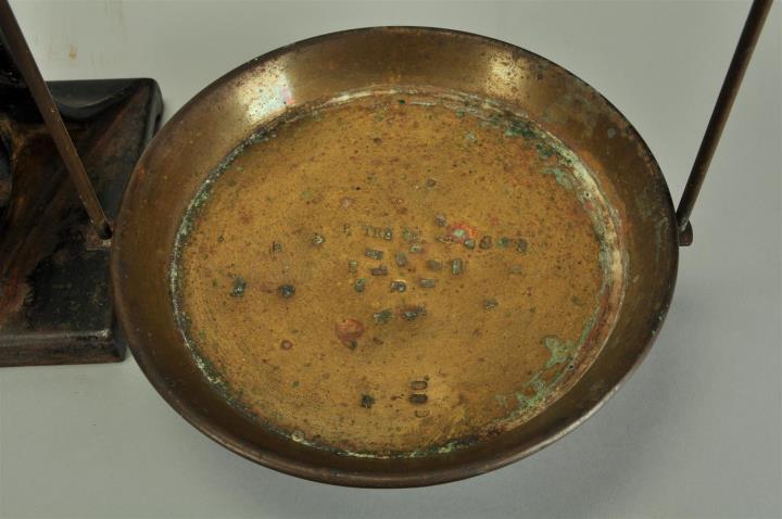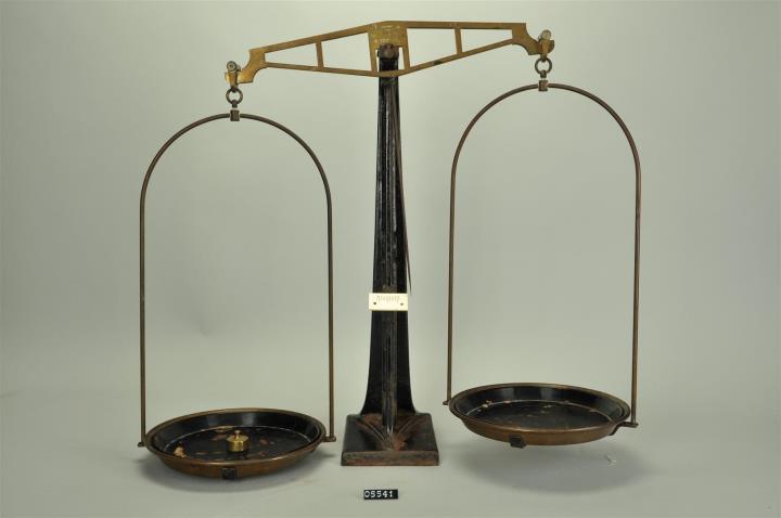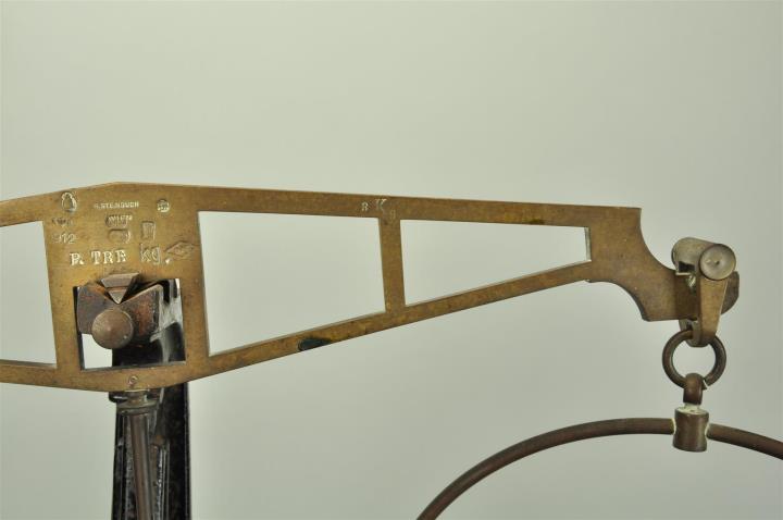 Durchbrochenes schwarze lackiertes Eisengestell. Balken durchbrochen aus Messing mit eingeprägter Angabe des Herstellers: H.STEINBUCH, WIEN. Messingschalen abnehmbar mit Eichstempel und mit Waageinlegeschalen. Tragkraft 3kg. Zusätzlich in der Mitte des Waagbalkens Angabe der Tragkraft in italienisch. Schalendurchmesser 190mm.