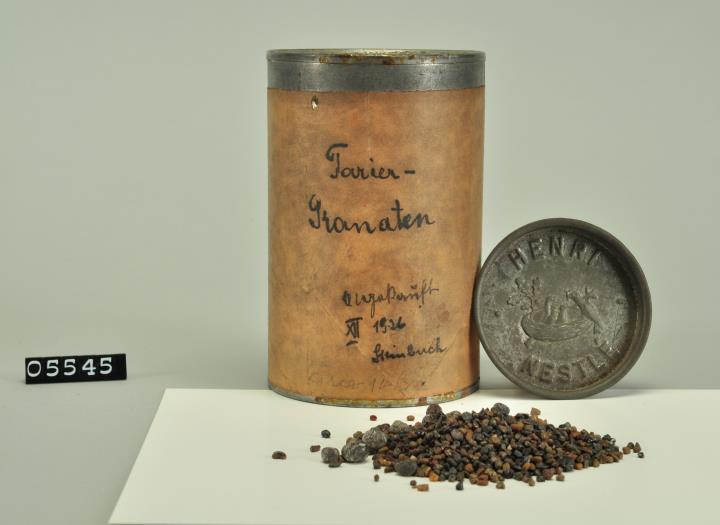 Tarierschrot in einer Nestle Blechdose, mit braunem Papier umhüllt. Darauf beschriftet von Friedrich Peer "Tarier-Granaten angekauft 12.1926 Steinbuch". Enthält Tarierschrot, als Gemisch aus Porzellan und Blei.