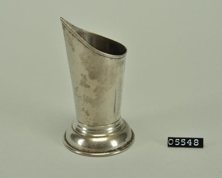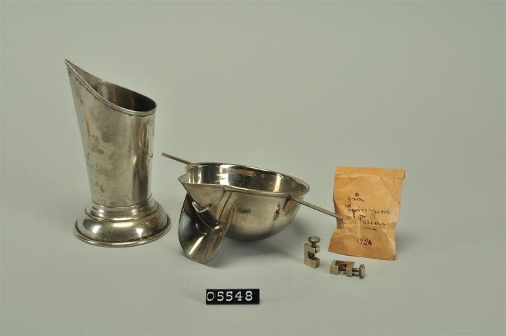 Tarierapparat "Tarion". Er wird solange mit Schrotkugeln aus dem Tarierbecher gefüllt, bis der Gewichtsausgleich erzielt ist. Erst dann wird das erforderliche Gewicht hinzugefügt. Angekauft 1926 in Wien.