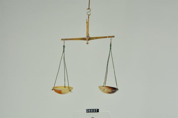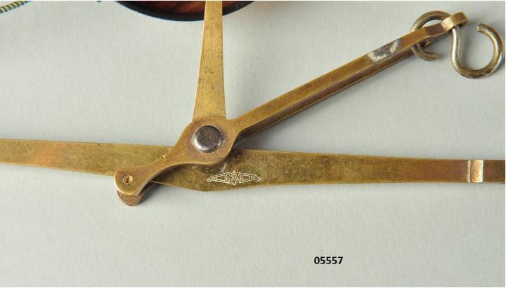 Präzisions-Handwaage mit Messingbalken und Hornschalen an Seidenschnüren. Flacher Zeiger. Firmenzeichen in der Mitte des Balkens: stilisierter Waagbalken mit in der Mitte verschungenen Buchstaben "K S". Ohne Eichstempel. Tragkraft 30g