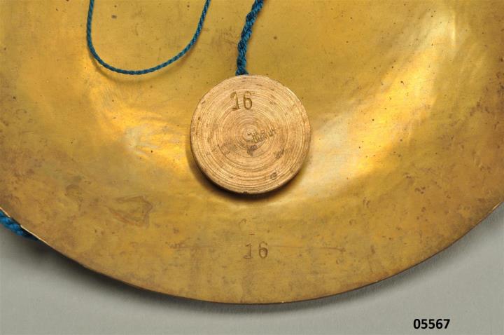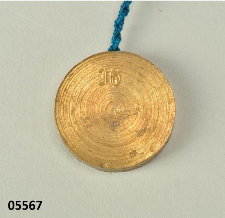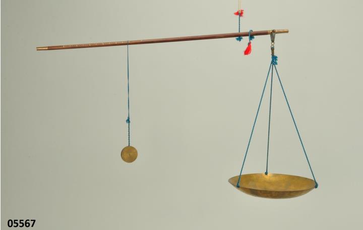 Schnellwaage zum Wiegen fester Körper; Waagschale und Gewicht sind aus Messing, der Balken aus Holz. Die Waagschale hängt mit drei grünen Schnüren am Waagbalken. Das Laufgewicht, in Form einer Scheibe mit eingeprägter Zahl "16" und Prägestempel hängt an einer grünen Schnur. Diese Waage wurde insbesondere zum Wiegen in einer Krankenhausapotheke verwendet. Mit zwei Handhaben.