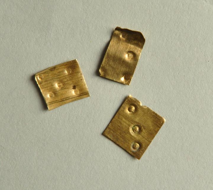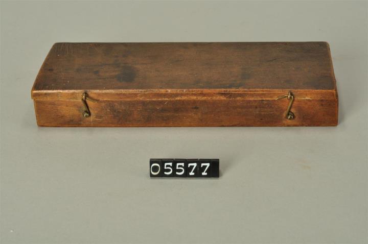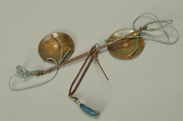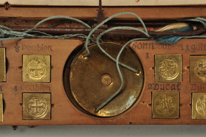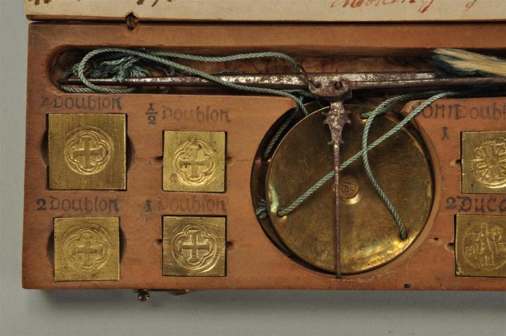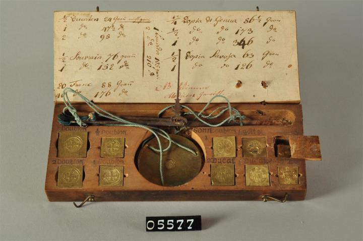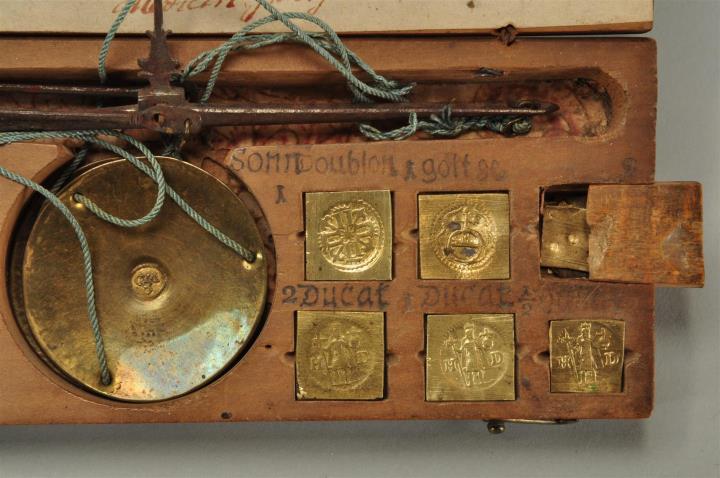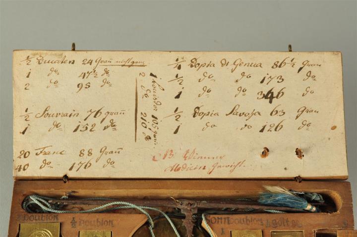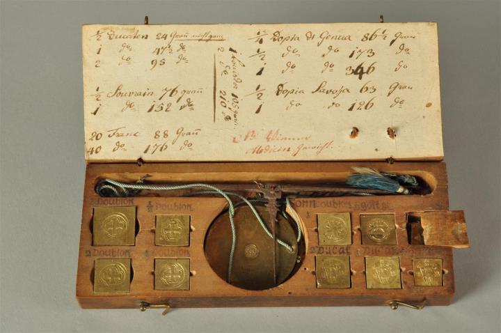 Münzwaage im rechteckigen, mittelbraunen Kasten aus Holz mit neun Bildgewichten und Schiebefach mit drei, verschieden großen, Ausgleichgewichten, genannt »Ass«. Handschriftliche Notizen füllen das gesamte Deckelinnere aus. Die Münzgewichte sind in grubenartigen Vertiefungen untergebracht, über denen der Name der Münze angegeben ist. Der Deckel des Holzkästchens wird in geschlossenem Zustand mit zwei Drahtschließen gesichert. Waagbalken aus Stahl mit runden, flachen an blauen Schnüren aufgehängte Waagschalen aus Messing.