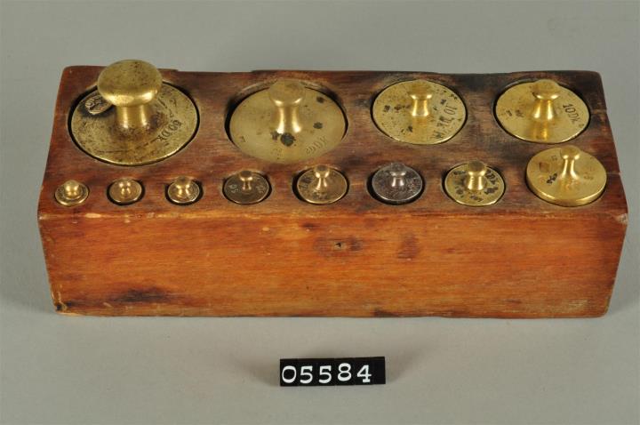 Gewichtssatz in poliertem Buchenetui. Deckel fehlt. Ohne Aussparung für Bruchgrammen und Pinzette. Satz mit 12 zylinderförmigen Gewichten aus Messing von 1g bis 50 DK. Davon 1dkg und 2g Gewichte doppelt. Gewichte mit Eichstempel.