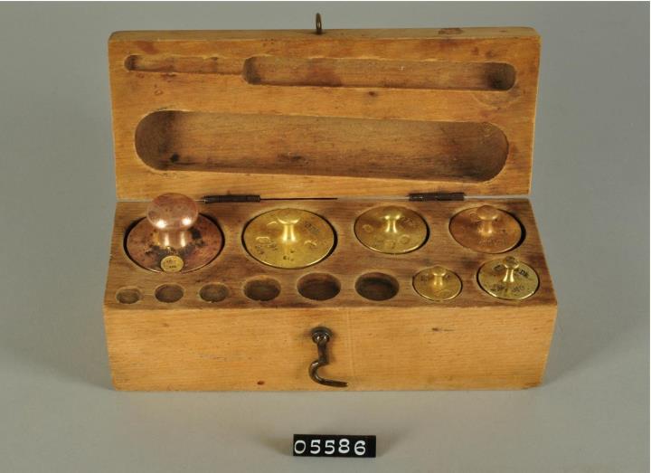 Gewichtssatz im Holzetui, ohne Aussparung für Bruchgrammen und Pinzette. Ursprünglich Satz mit 12 flachen Gewichten aus Messing von 1g bis 50Dk. Davon nur mehr von 2Dk bis und 50 Dk vorhanden. Gewichte mit Eichstempel.