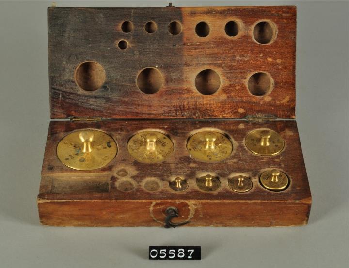 Gewichtssatz im Holzetui aus poliertem Buchenholz, mit Aussparung für Bruchgrammen. Ursprünglich Satz mit 11 konisch zulaufenden Gewichten aus Messing von 1g bis 200g. Davon nur mehr die Gewichte von 5g bis und 200g vorhanden. Gewichte mit Eichstempel, eins davon mit Eichung 1876.