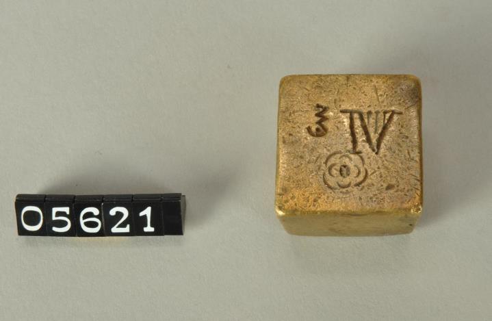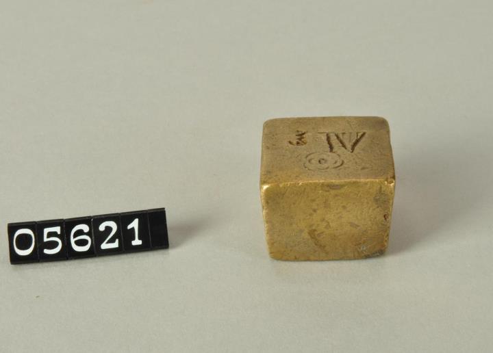 Um sich von den anderen Gewichten zu unterscheiden, war das Apothekergewicht bis zu 1/4 Drachme viereckig, unten schmäler als oben, in Form einer abgeschnittenen und umgedrehten Pyramide. Aus Messing. An der fast quadratischen Oberseite Angabe und Bezeichnung des Gewichtes, ohne Doppeladler in einem Kreis und ohne rechteckige Eichmarke, hier 818. Wiegt 138,71g