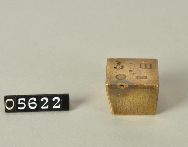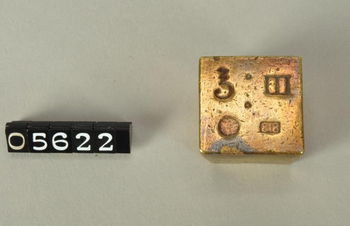 Um sich von den anderen Gewichten zu unterscheiden, war das Apothekergewicht bis zu 1/4 Drachme viereckig, unten schmäler als oben, in Form einer abgeschnittenen und umgedrehten Pyramide. Aus Messing. An der fast quadratischen Oberseite Angabe und Bezeichnung des Gewichtes, mit Doppeladler in einem Kreis und rechteckige Eichmarke, hier 818. Wiegt 104,90g