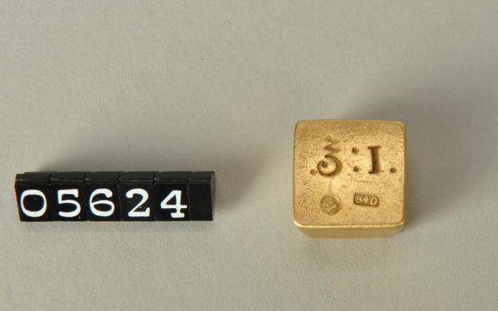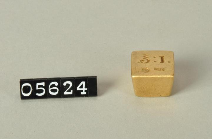 Um sich von den anderen Gewichten zu unterscheiden, war das Apothekergewicht bis zu 1/4 Drachme viereckig, unten schmäler als oben, in Form einer abgeschnittenen und umgedrehten Pyramide. Aus Messing. An der fast quadratischen Oberseite Angabe und Bezeichnung des Gewichtes, mit Doppeladler in einem Kreis und rechteckige Eichmarke, hier 840. Wiegt 34,62g, Nenngewicht vor 1870 = 35,00075g