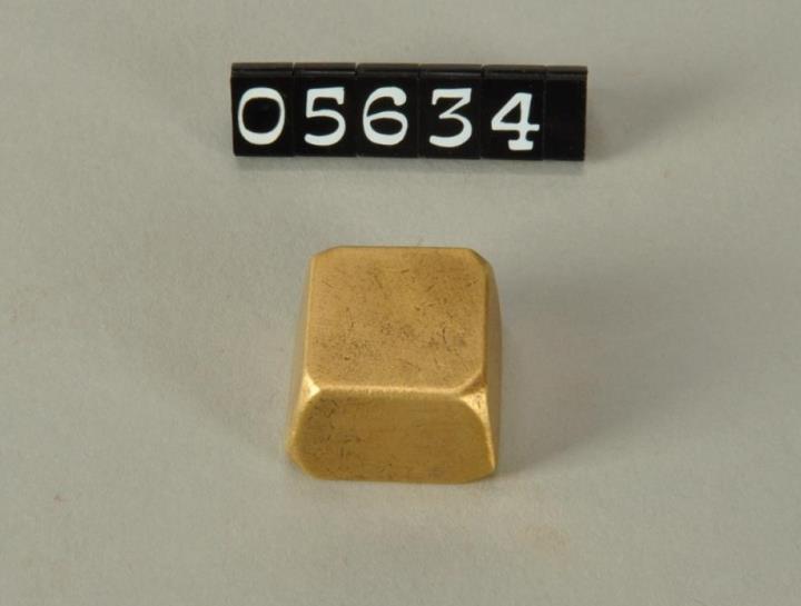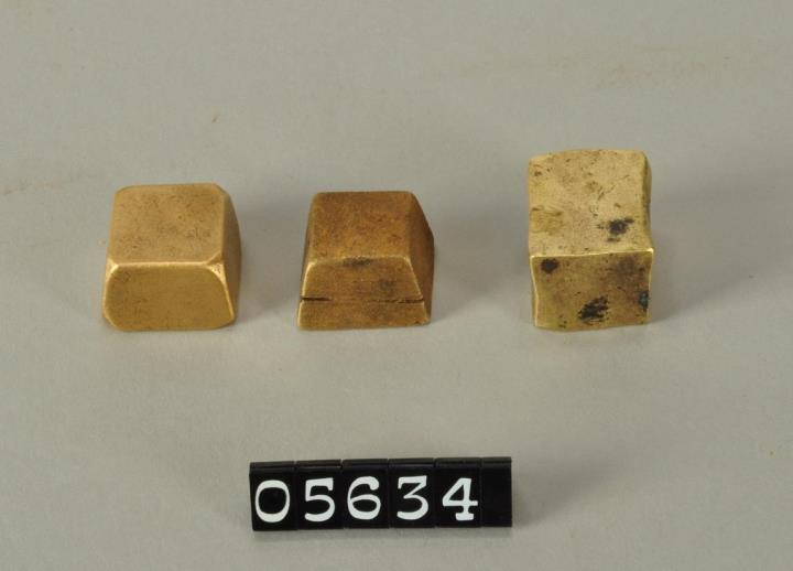 Zwei Gewichte aus Messing, in Form einer abgeschnittenen Pyramide, unregelmäßig viereckig, oben schmäler als unten, Ecken abgerundet. Eine davon eingeschnitten. Drittes Gewicht rechteckig mit unregelmäßigen Rändern auch aus Messing. Alle ohne Bezeichnungen bzw. Gravierungen.