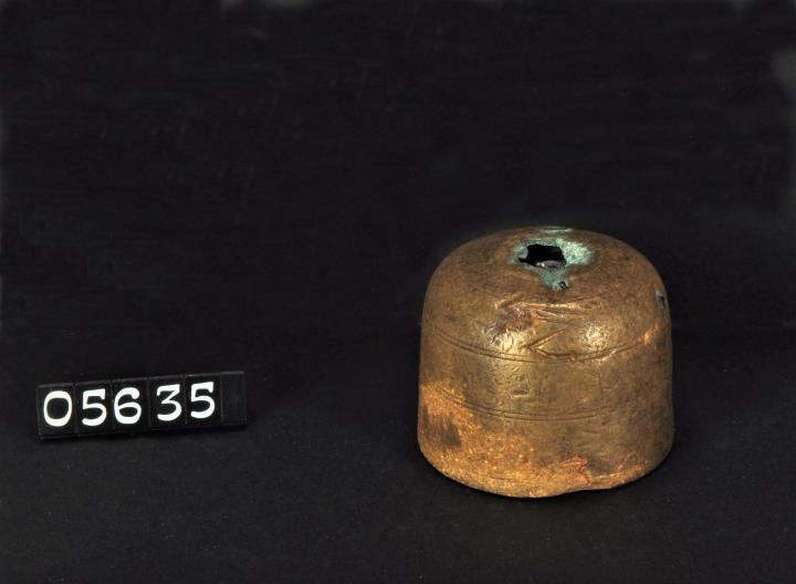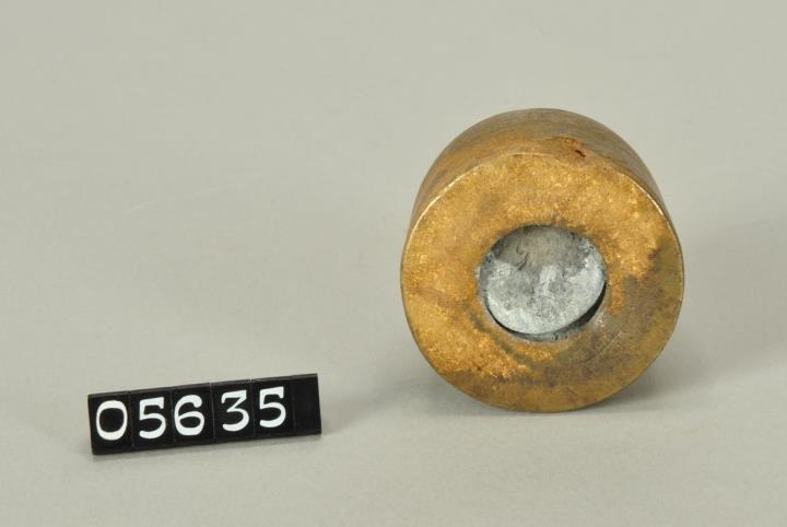 Glockenförmiges Handelsgewicht um 1750. Ohne Henkel. An der Wand rundum vier eingravierte Doppellinien. Boden mit Öffnung, darin Bleifüllung offensichtlich zur genauen Justierung des Gewichtes. Wiegt genau 265,34 gr. Könnte zu einem Wiener Handels-Gewicht-Satz gehören. Handhabe fehlt. An der Schulter eingraviertes »Z«.