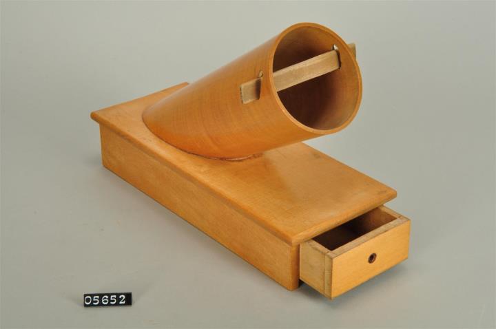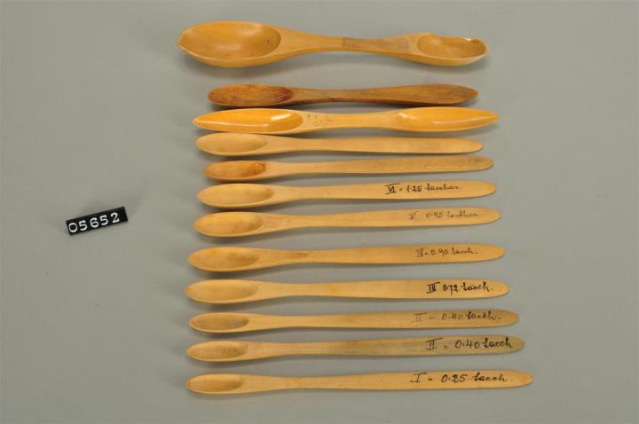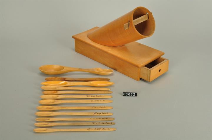 Pulverabfüll-Gerät aus lackiertem Holz mit Schublade, darin verschiedene Größen von 12 Pulvermeßlöffeln, ebenso aus Holz. Beschriftet von Friedrich Peer. Einsatzbecher aus Glas. Becher und Abstreifer herausnehmbar. Wurde zur Massenverpackung von pulverförmiger oder feinkörniger Substanzen verwendet.