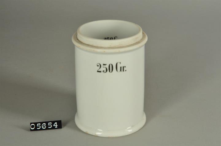 Porzellantiegel innen und außen glasiert mit Wulsrand, ohne Deckel. Zylindrische Form. Innen eingebrannte, schwarze Unterteilung in 25g-Schritten. Außen »250 Gr.« schwarz eingebrannt. Mit Standring.