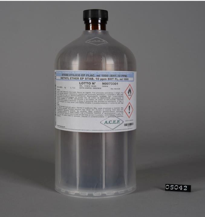 Braune, runde Flasche aus Glas, mit schwarzem Schraubverschluss in Sicherheitsverpackung aus Plastik der Firma A.C.E.F.. Orignaletikett. Signiert: Etere etilico, Diethylether. Enthielt Äther.