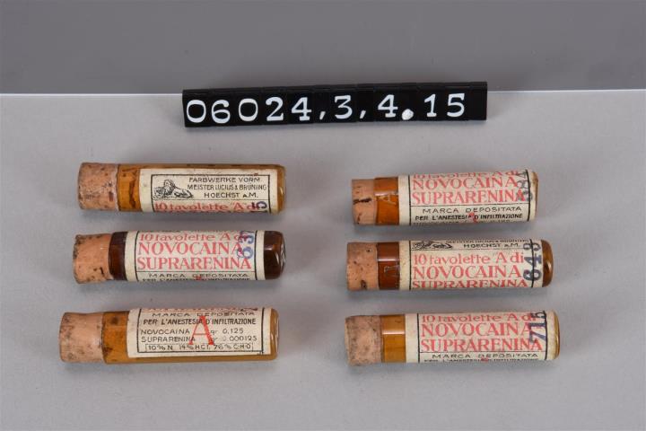 Braune Glasröhrchen mit je 10 Tabletten Novocaina-Suprarenina "A" der Farbwerke vorm. Meister Lucius & Brüning, Hoechst a. M.. Aufgedrucktes "A" am Röhrchenhals. Verschiedene Chargen. Etikett im Querformat mit liegendem Löwen, dem nassauischen Wappentier, italienisch bedruckt. Dieses am Rand gestempelt, z.B. mit 584, 561, 637, 643, 648 oder 715. Ohne Inhalt. Verschlossen mit einem Korken. Zusammensetzung: Novocaina gr 0,125 Suprarenina gr 0,000125 (10% N 14% HCL; 76% C.H.O)