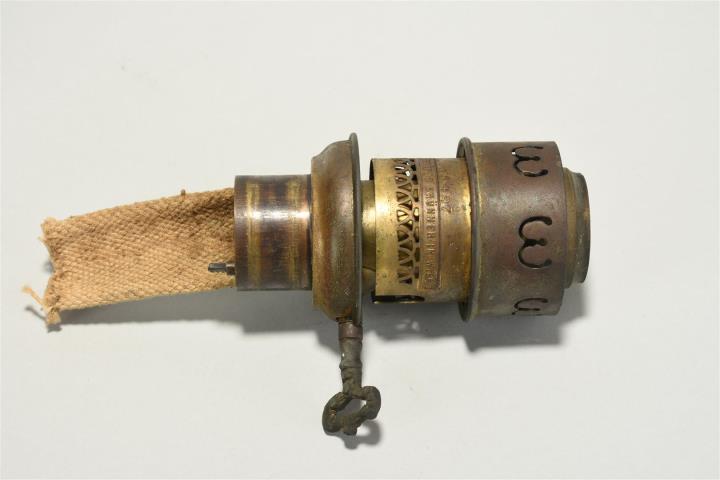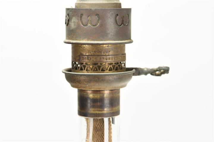 Runde Säule mit quadratishem Fuß aus Holz, braun gestrichen. Zapfentank aus Glas mit einem Messingzapfen. Mit nur mehr einen Halter für den Lampenschirm. Ursprünglich ein runder Globus aus Glas, der verloren gegangen ist. Brenner mit Flammscheibe der Firma Gebrüder Brünner in Wien. Seriennummer 65497. Der dazu passende Matadorzylinder fehlt.