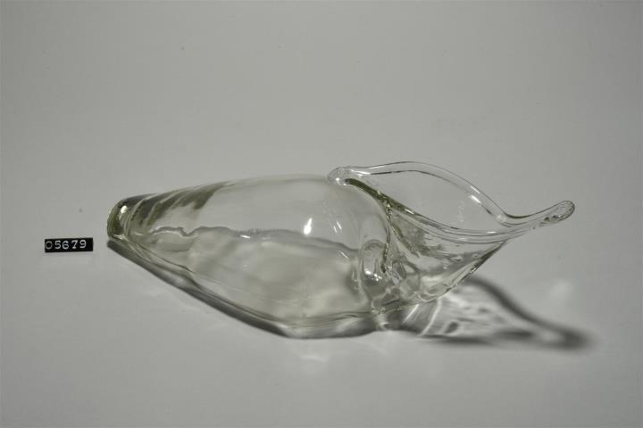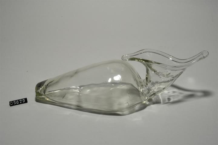 Mundgeblasener entenförmiger Glaskörper länglicher, speziell für Frauen geformte Öffnung (Trichteraufsatz), die es erlauben eine Urinflasche im Stehen, Liegen oder Sitzen zu verwenden. Die Öffnung ist am Glaskörper aufgesetzt, Mündungsrand mit umgelegtem Faden. Ausgeschliffener Hefteisenabriss.