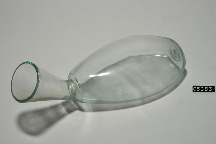 Mundgeblasener entenförmiger Glaskörper mit längerem, schräg augesetztem konischförmigen Hals. Der Hals ist auf dem Glaskörper aufgesetzt, der Mündungsrand manuell nachgearbeitet . Mit Hefteisenabriss. Nicht planer Boden.