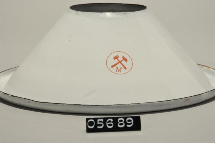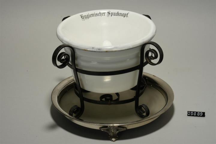 Spucknapf für öffentliche Gebäude. Metallteller mit drei ornamentalen Füßen, darauf ein vierbeiniges Eisengestell mit schneckenförmigen Enden. Darin ein Auffagngbehälter aus Milchglas mit hochgezogenem Mittelzapfen und darüber ein Spucktrichter aus Metall. Schriftzug im inneren des Trichters "Hygienischer Spucknapf" und auf der Gegenseite "gesetzlich geschützt.". An der äußeren Wandung das Markenzeichen der Metallfabrik.
