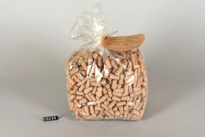 Verschiedene kleine Naturkorken für Enghalsgefäße, aus natürlicher Korkrinde gewonnen. Verschiedene Größen, rund, konisch verjüngend zusammenlaufend, d.h. der obere Durchmeser ist größer als der untere Durchmesser des Korkens. Für diese konischen Korken, Spitzkorken genannt, benötigt man kein Werkzeug zum Aufstecken. Mit Originalanhänger der Firma Chemofarm aus Bozen. Unterschiedliche Qualitäten.