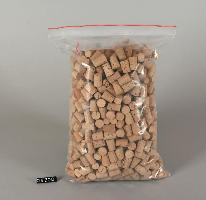 Verschiedene kleine Naturkorken für Enghalsgefäße, aus natürlicher Korkrinde gewonnen. Verschiedene Größen, rund, konisch verjüngend zusammenlaufend, d.h. der obere Durchmeser ist größer als der untere Durchmesser des Korkens. Für diese konischen Korken, Spitzkorken genannt, benötigt man kein Werkzeug zum Aufstecken. Unterschiedliche Qualitäten.